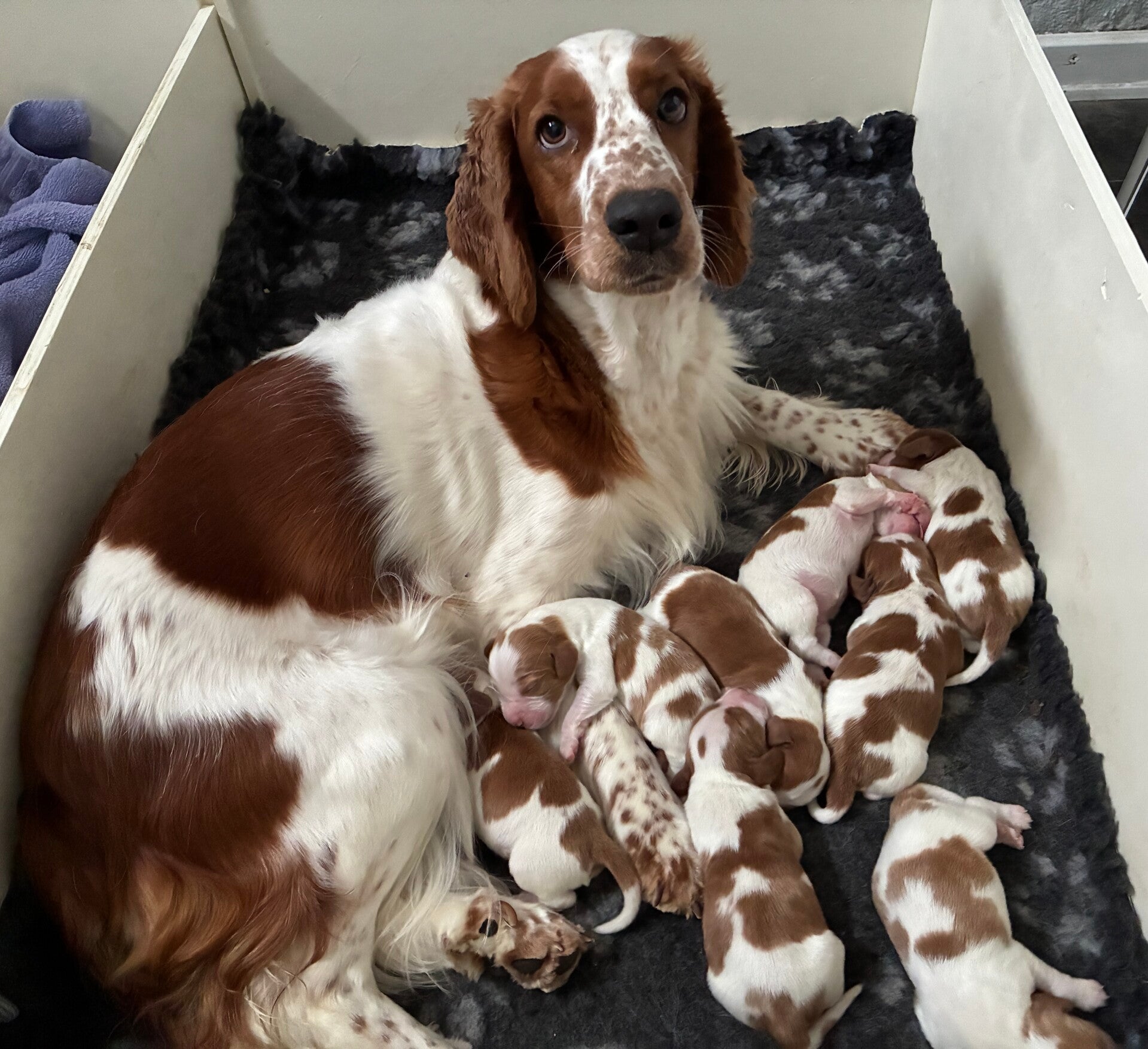 Lina med sine nyfødte hvalpe, 1 dag gamle.